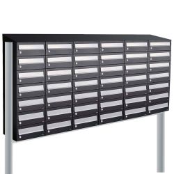Complete brievenbusunit met statief voor vrijstaande plaatsing bestaande uit 42 compacte verticaal gekoppelde brievenbussen, optioneel met dakje. Allux Hive is gemaakt van hoogwaardig gepoedercoat gegalvaniseerd staal (zwart) en aluminiumgrijze stalen briefklep. Door de topkwaliteit en sterke (los verkrijgbare) onderdelen is deze serie zeer geschikt voor gebruik in steden. Iedere brievenbus is voorzien van een degelijk cilinderslot met 2 sleutels.