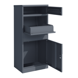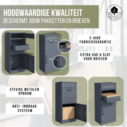 Post en pakketjes ontvangt u veilig in deze moderne antracietgrijze vrijstaande pakketbrievenbus Basic met apart postvak. De brievenbus is gemaakt van gepoedercoat staal, heeft een valklep-systeem en zowel het pakketgedeelte als het postvak is voorzien van een degelijk slot met 2 sleutels. Bevestingsmateriaal voor bodemmontage wordt meegeleverd. Montage aan de muur kan ook, u dient dan zelf gaatjes te boren in de achterkant.
